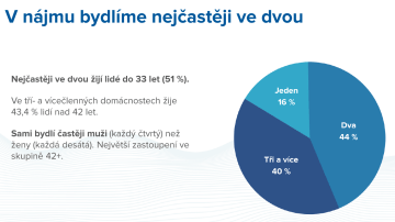 „Většina Čechů bydlí ve vlastním, pronájem využívá jen 22 % z nich. V Německu nebo Rakousku je přitom toto číslo více než dvojnásobné. Z lidí, kteří žijí v nájmu, v něm plánuje 40 % zůstat trvale a zhruba stejný podíl (42 %) si chce po čase pořídit vlastní dům či byt,“ říká ředitel CREDITAS Real Estate Jiří Vajner. Většina nájemníků (88 %) bydlí v bytech, dům má pronajatý jen 12 % lidí.